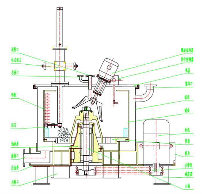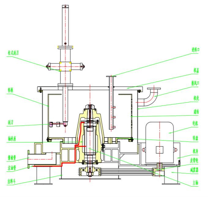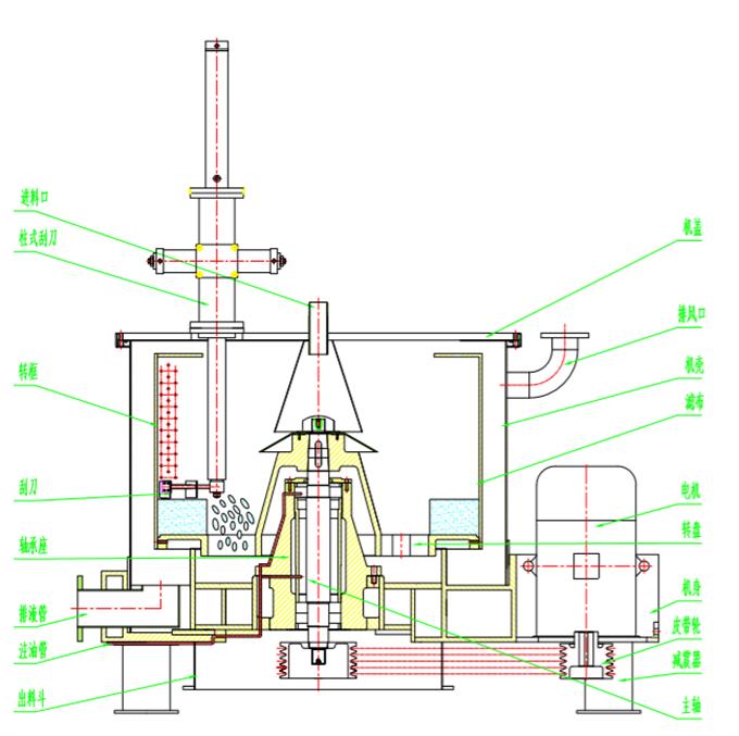 P(L)GZ型離心機適合分離含固相物粒度大于0,01mm的懸浮液,電動(dòng)機帶動(dòng)轉鼓旋轉,在進(jìn)料轉速時(shí),物料由進(jìn)料管引入轉鼓旋轉,進(jìn)料達到預定容積后停止進(jìn)料,升至高速分離,在離心力的作用下,液相物穿過(guò)濾布和轉鼓壁濾孔排出轉鼓,經(jīng)排液管排出機外,固相物截留在轉鼓內,分離完畢轉速至卸料轉速狀態(tài),刮刀自動(dòng)升降、旋轉往復運行,將固相物從轉鼓刮下,從離心機下部卸出。