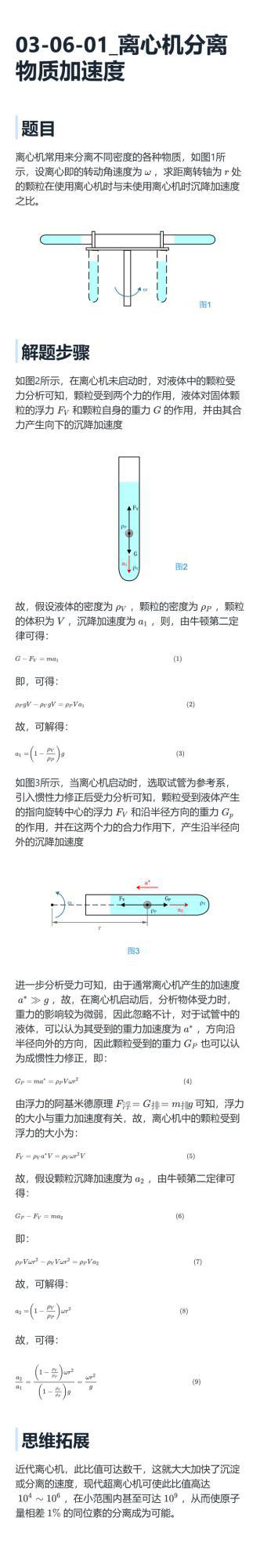 我們共同來(lái)研究一下離心機的工作原理,并通過(guò)研究離心機的工作原理來(lái)理解并掌握浮力和離心力在加快物質(zhì)沉降過(guò)程中的作用,通過(guò)本期題目,同學(xué)們可以對離心力有更為深刻的認識和理解,并通過(guò)這個(gè)題目中設計的場(chǎng)景,簡(jiǎn)單的理解一下很多影視作品中的太空船為什么都在旋轉了,這個(gè)旋轉運動(dòng)會(huì )產(chǎn)生怎樣的作用效果,以及在旋轉中的太空船中,重力的方向具體指向那邊,是不是與地球表面的重力方向相同?這些問(wèn)題的答案其實(shí)都在這個(gè)題目中有所涉及,當然小編并沒(méi)有非常全面的在解題過(guò)程中說(shuō)明上面的問(wèn)題,但在后面的題目的分析過(guò)程中,小編在著(zhù)重講授離心力的時(shí)候,對上述問(wèn)題都會(huì )詳細說(shuō)明的。
